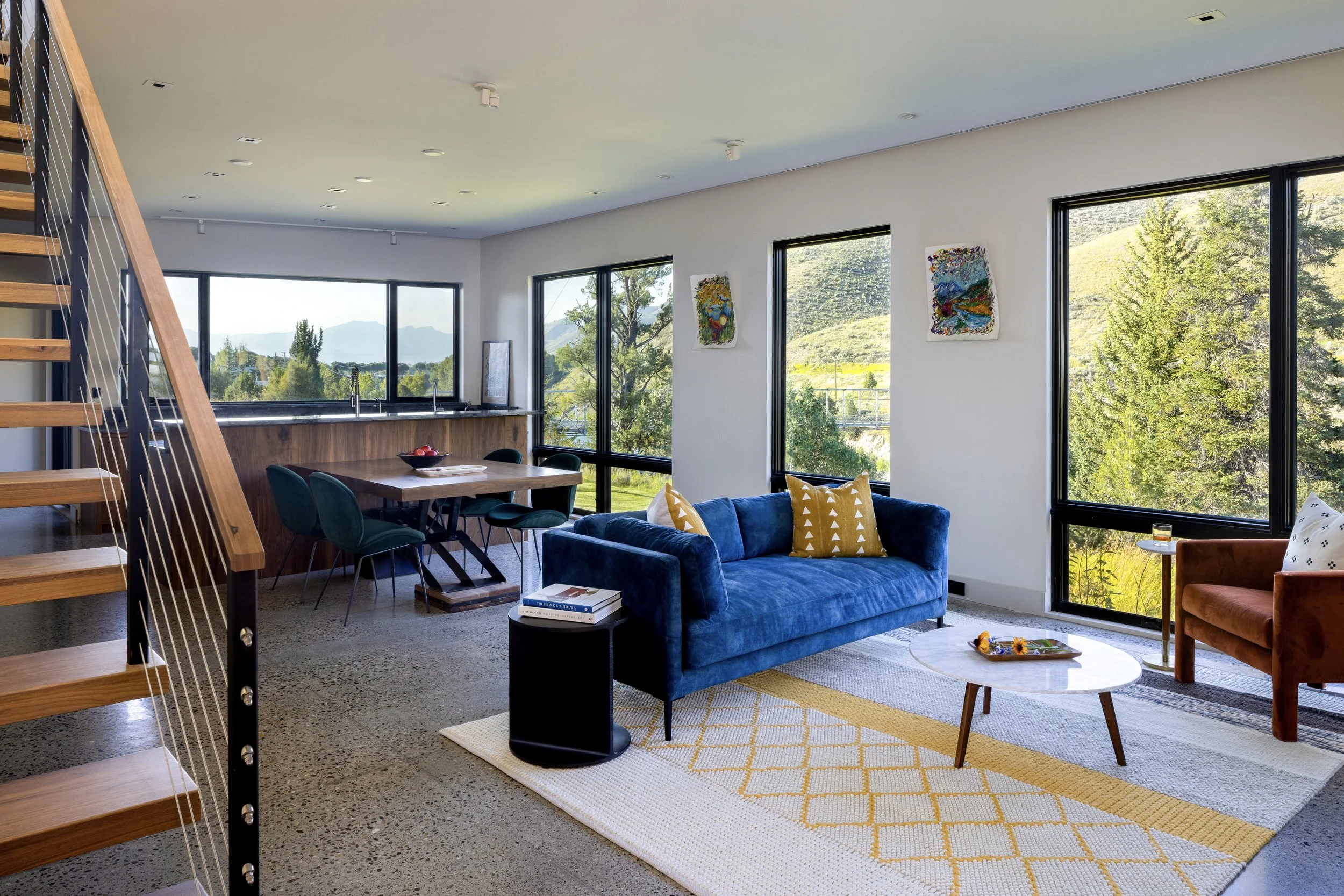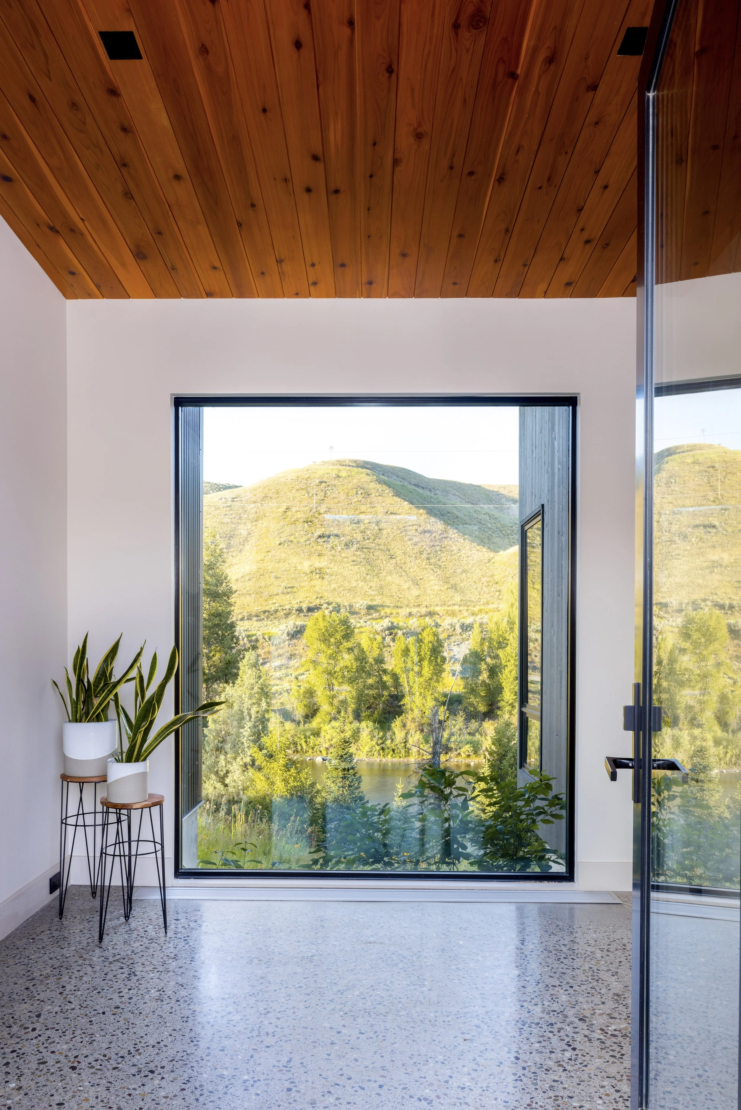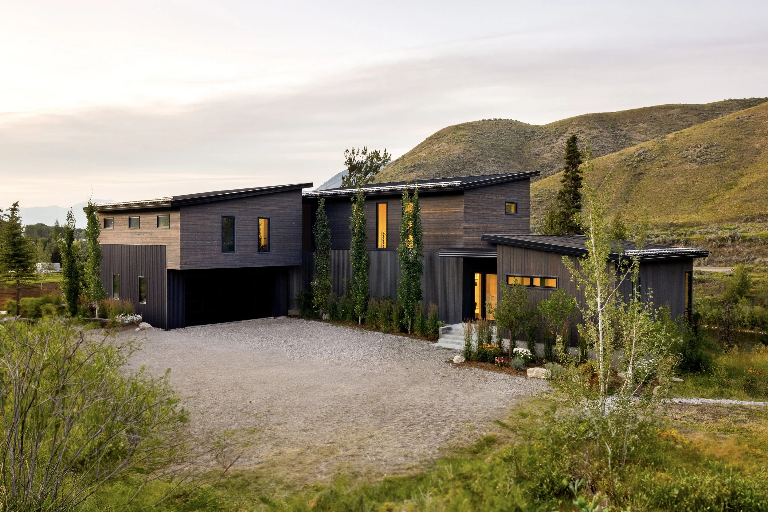 Located at the southern end of the Jackson Hole valley, this house draws design inspiration from the banks of the scenic Snake River which it overlooks. Just as the river has eroded the hillside as it passes, the house's lower levels recede back allowing the upper levels to cantilever out towards the river. Large spans of glazing are strategically placed to reveal beautiful vignettes of the waterfront below and the changing colors of the hillsides beyond, all while ensuring that the connection to the outdoors is ever-present.